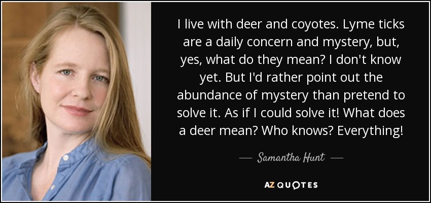 I live with deer and coyotes. Lyme ticks are a daily concern and mystery, but, yes, what do they mean? I don't know yet. But I'd rather point out the abundance of mystery than pretend to solve it. As if I could solve it! What does a deer mean? Who knows? Everything!