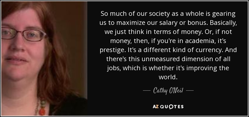 So much of our society as a whole is gearing us to maximize our salary or bonus. Basically, we just think in terms of money. Or, if not money, then, if you're in academia, it's prestige. It's a different kind of currency. And there's this unmeasured dimension of all jobs, which is whether it's improving the world.