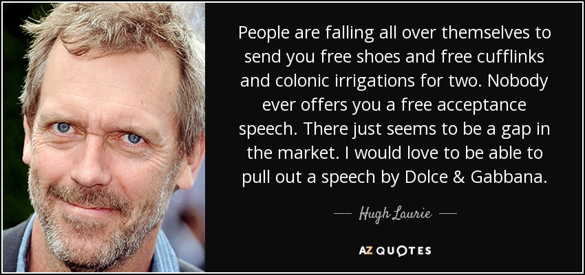 People are falling all over themselves to send you free shoes and free cufflinks and colonic irrigations for two. Nobody ever offers you a free acceptance speech. There just seems to be a gap in the market. I would love to be able to pull out a speech by Dolce & Gabbana.