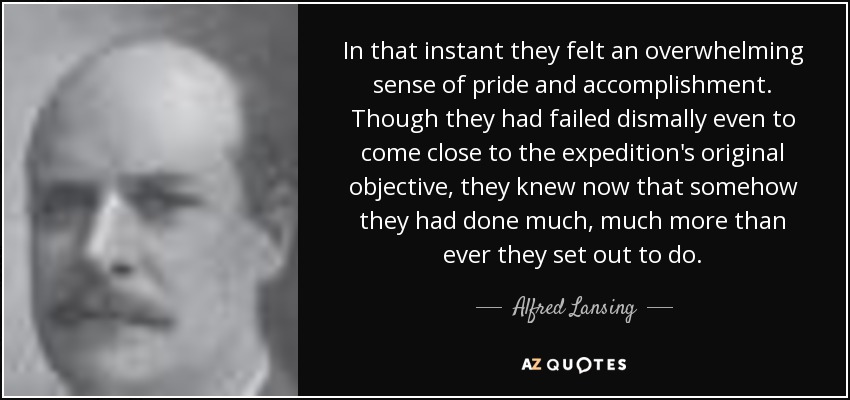 In that instant they felt an overwhelming sense of pride and accomplishment. Though they had failed dismally even to come close to the expedition's original objective, they knew now that somehow they had done much, much more than ever they set out to do.