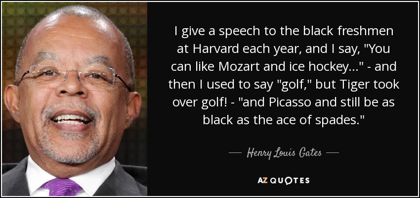 I give a speech to the black freshmen at Harvard each year, and I say, "You can like Mozart and ice hockey..." - and then I used to say "golf," but Tiger took over golf! - "and Picasso and still be as black as the ace of spades."