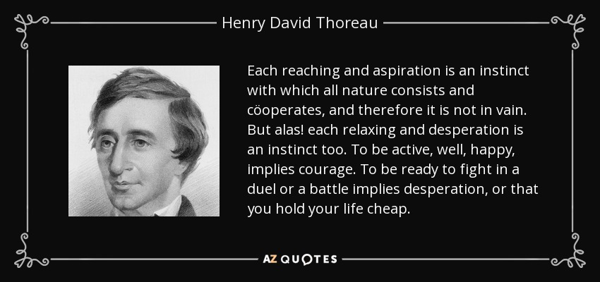 Each reaching and aspiration is an instinct with which all nature consists and cöoperates, and therefore it is not in vain. But alas! each relaxing and desperation is an instinct too. To be active, well, happy, implies courage. To be ready to fight in a duel or a battle implies desperation, or that you hold your life cheap.
