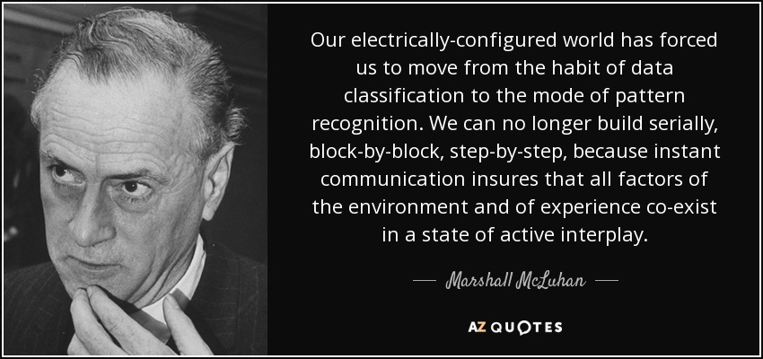 Our electrically-configured world has forced us to move from the habit of data classification to the mode of pattern recognition. We can no longer build serially, block-by-block, step-by-step, because instant communication insures that all factors of the environment and of experience co-exist in a state of active interplay.