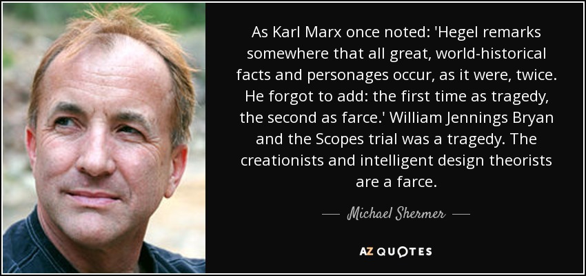 As Karl Marx once noted: 'Hegel remarks somewhere that all great, world-historical facts and personages occur, as it were, twice. He forgot to add: the first time as tragedy, the second as farce.' William Jennings Bryan and the Scopes trial was a tragedy. The creationists and intelligent design theorists are a farce.