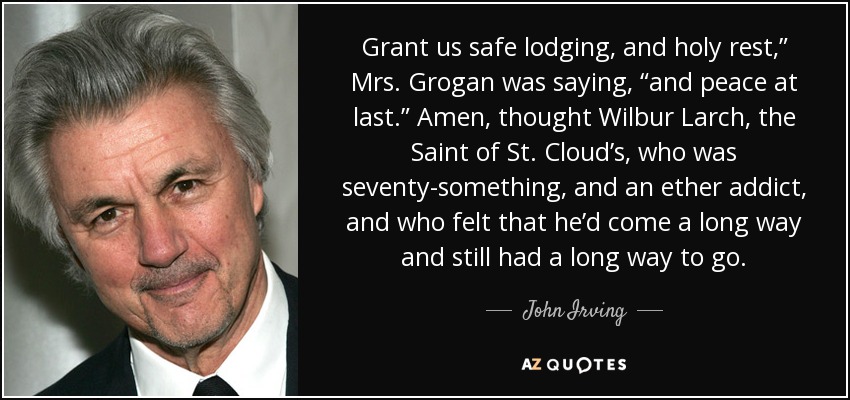 Grant us safe lodging, and holy rest,” Mrs. Grogan was saying, “and peace at last.” Amen, thought Wilbur Larch, the Saint of St. Cloud’s, who was seventy-something, and an ether addict, and who felt that he’d come a long way and still had a long way to go.