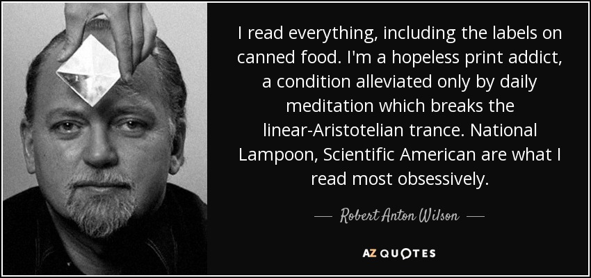 I read everything, including the labels on canned food. I'm a hopeless print addict, a condition alleviated only by daily meditation which breaks the linear-Aristotelian trance. National Lampoon, Scientific American are what I read most obsessively.