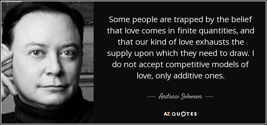 Some people are trapped by the belief that love comes in finite quantities, and that our kind of love exhausts the supply upon which they need to draw. I do not accept competitive models of love, only additive ones.