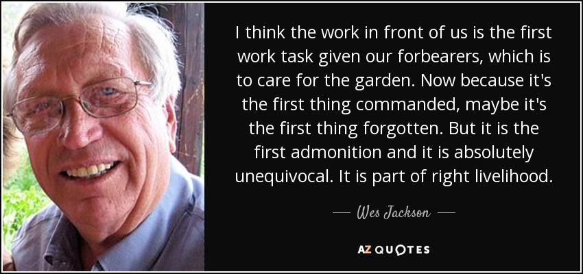 I think the work in front of us is the first work task given our forbearers, which is to care for the garden. Now because it's the first thing commanded, maybe it's the first thing forgotten. But it is the first admonition and it is absolutely unequivocal. It is part of right livelihood.