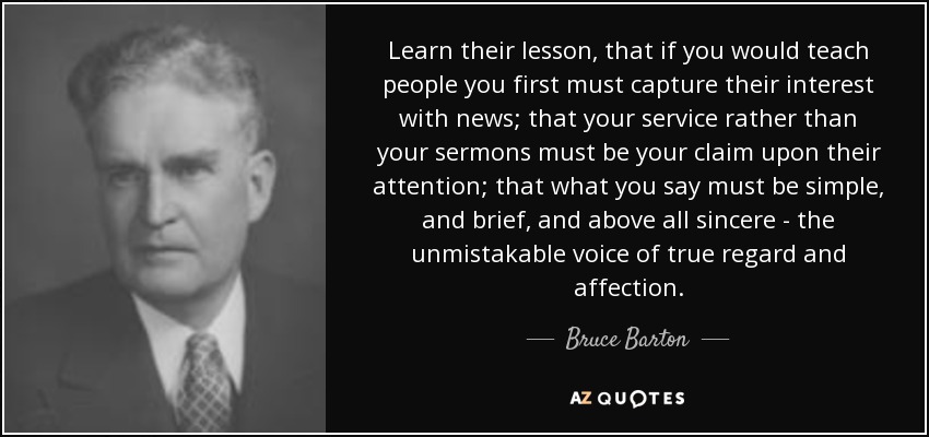 Learn their lesson, that if you would teach people you first must capture their interest with news; that your service rather than your sermons must be your claim upon their attention; that what you say must be simple, and brief, and above all sincere - the unmistakable voice of true regard and affection.