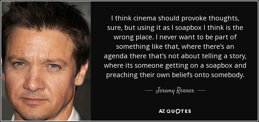 I think cinema should provoke thoughts, sure, but using it as I soapbox I think is the wrong place. I never want to be part of something like that, where there's an agenda there that's not about telling a story, where its someone getting on a soapbox and preaching their own beliefs onto somebody.