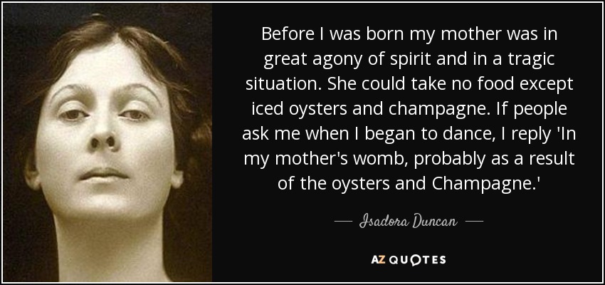 Before I was born my mother was in great agony of spirit and in a tragic situation. She could take no food except iced oysters and champagne. If people ask me when I began to dance, I reply 'In my mother's womb, probably as a result of the oysters and Champagne.'