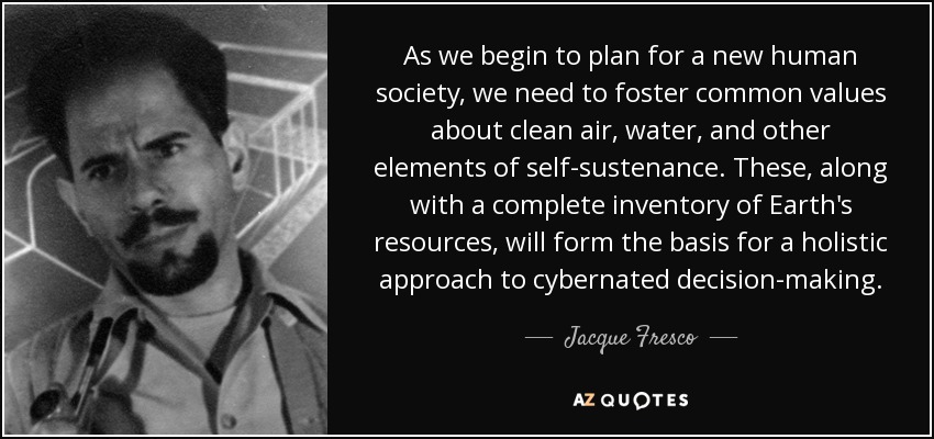 As we begin to plan for a new human society, we need to foster common values about clean air, water, and other elements of self-sustenance. These, along with a complete inventory of Earth's resources, will form the basis for a holistic approach to cybernated decision-making.