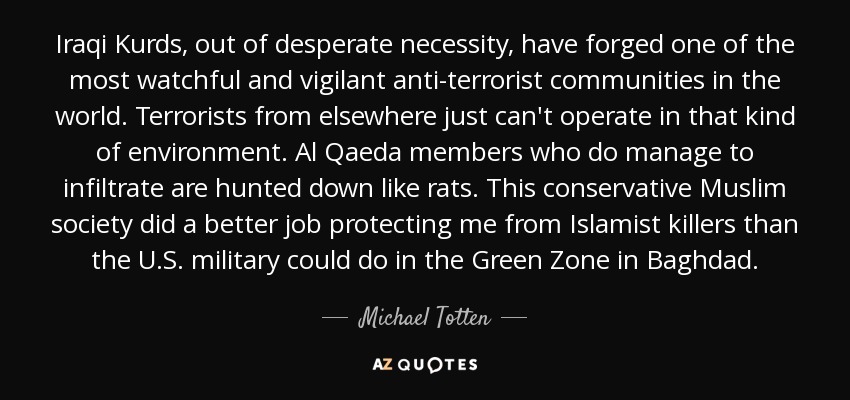 Iraqi Kurds, out of desperate necessity, have forged one of the most watchful and vigilant anti-terrorist communities in the world. Terrorists from elsewhere just can't operate in that kind of environment. Al Qaeda members who do manage to infiltrate are hunted down like rats. This conservative Muslim society did a better job protecting me from Islamist killers than the U.S. military could do in the Green Zone in Baghdad.