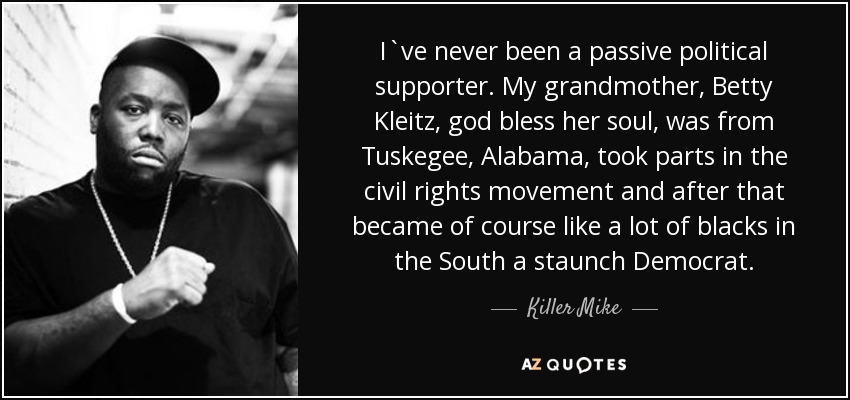 I`ve never been a passive political supporter. My grandmother, Betty Kleitz , god bless her soul, was from Tuskegee, Alabama, took parts in the civil rights movement and after that became of course like a lot of blacks in the South a staunch Democrat.