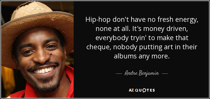 Hip-hop don't have no fresh energy, none at all. It's money driven, everybody tryin' to make that cheque, nobody putting art in their albums any more.