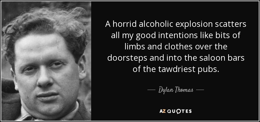 A horrid alcoholic explosion scatters all my good intentions like bits of limbs and clothes over the doorsteps and into the saloon bars of the tawdriest pubs.
