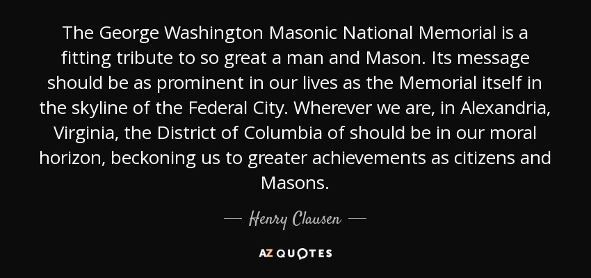 The George Washington Masonic National Memorial is a fitting tribute to so great a man and Mason. Its message should be as prominent in our lives as the Memorial itself in the skyline of the Federal City. Wherever we are, in Alexandria, Virginia, the District of Columbia of should be in our moral horizon, beckoning us to greater achievements as citizens and Masons.