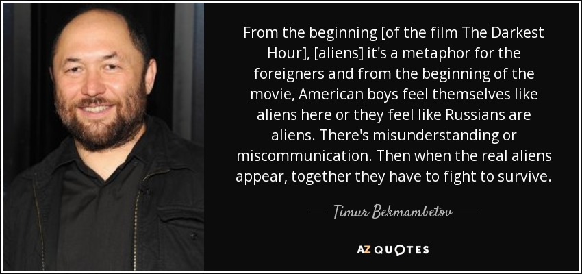 From the beginning [of the film The Darkest Hour], [aliens] it's a metaphor for the foreigners and from the beginning of the movie, American boys feel themselves like aliens here or they feel like Russians are aliens. There's misunderstanding or miscommunication. Then when the real aliens appear, together they have to fight to survive.
