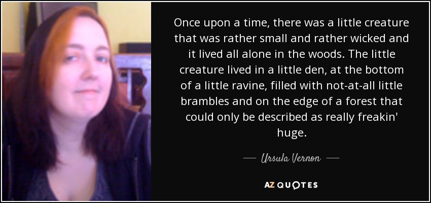 Once upon a time, there was a little creature that was rather small and rather wicked and it lived all alone in the woods. The little creature lived in a little den, at the bottom of a little ravine, filled with not-at-all little brambles and on the edge of a forest that could only be described as really freakin' huge.