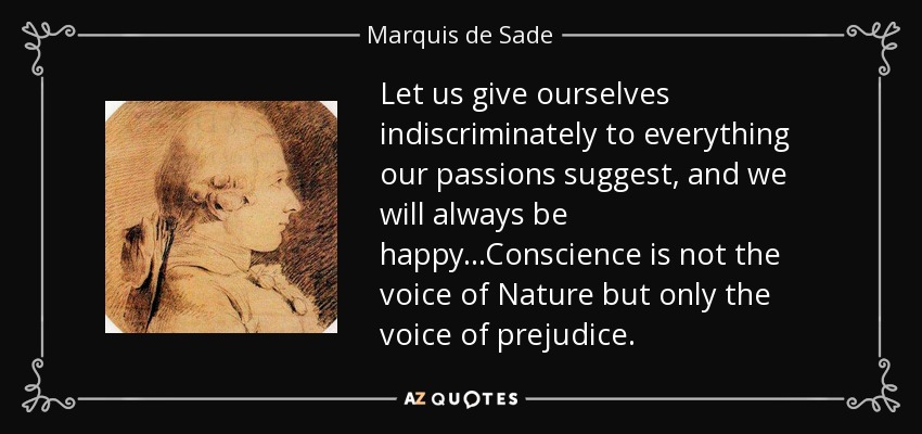 Let us give ourselves indiscriminately to everything our passions suggest, and we will always be happy...Conscience is not the voice of Nature but only the voice of prejudice.