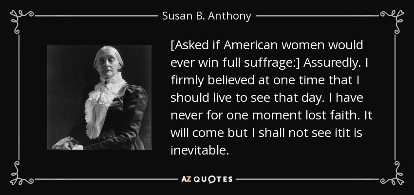 [Asked if American women would ever win full suffrage:] Assuredly. I firmly believed at one time that I should live to see that day. I have never for one moment lost faith. It will come but I shall not see itit is inevitable.