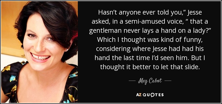 Hasn’t anyone ever told you,” Jesse asked, in a semi-amused voice, “ that a gentleman never lays a hand on a lady?” Which I thought was kind of funny, considering where Jesse had had his hand the last time I’d seen him. But I thought it better to let that slide.