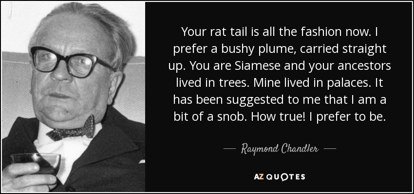 Your rat tail is all the fashion now. I prefer a bushy plume, carried straight up. You are Siamese and your ancestors lived in trees. Mine lived in palaces. It has been suggested to me that I am a bit of a snob. How true! I prefer to be.