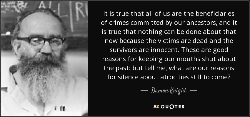 It is true that all of us are the beneficiaries of crimes committed by our ancestors, and it is true that nothing can be done about that now because the victims are dead and the survivors are innocent. These are good reasons for keeping our mouths shut about the past: but tell me, what are our reasons for silence about atrocities still to come?