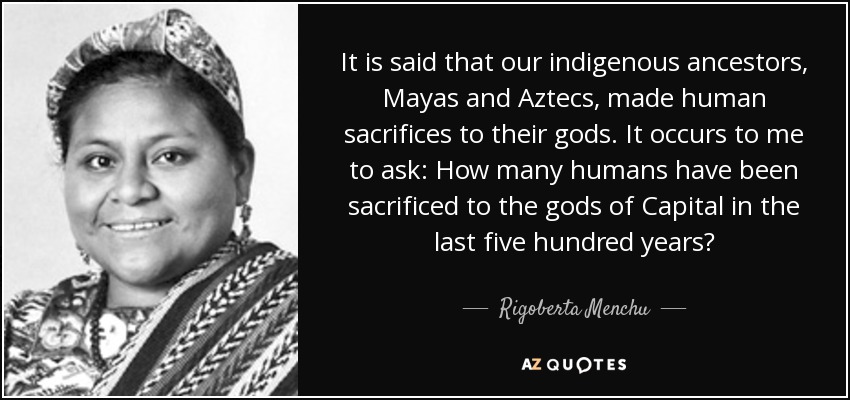 It is said that our indigenous ancestors, Mayas and Aztecs, made human sacrifices to their gods. It occurs to me to ask: How many humans have been sacrificed to the gods of Capital in the last five hundred years?