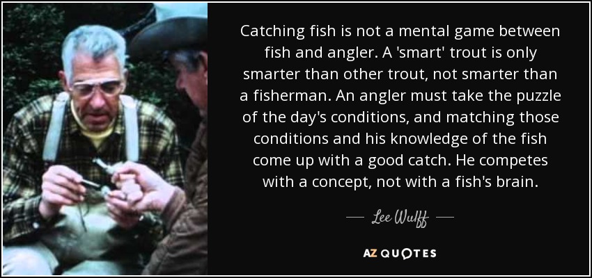 Catching fish is not a mental game between fish and angler. A 'smart' trout is only smarter than other trout, not smarter than a fisherman. An angler must take the puzzle of the day's conditions, and matching those conditions and his knowledge of the fish come up with a good catch. He competes with a concept, not with a fish's brain.