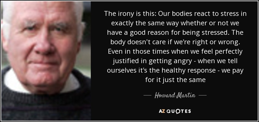 The irony is this: Our bodies react to stress in exactly the same way whether or not we have a good reason for being stressed. The body doesn't care if we're right or wrong. Even in those times when we feel perfectly justified in getting angry - when we tell ourselves it's the healthy response - we pay for it just the same
