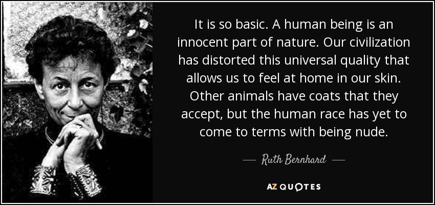 It is so basic. A human being is an innocent part of nature. Our civilization has distorted this universal quality that allows us to feel at home in our skin. Other animals have coats that they accept, but the human race has yet to come to terms with being nude.