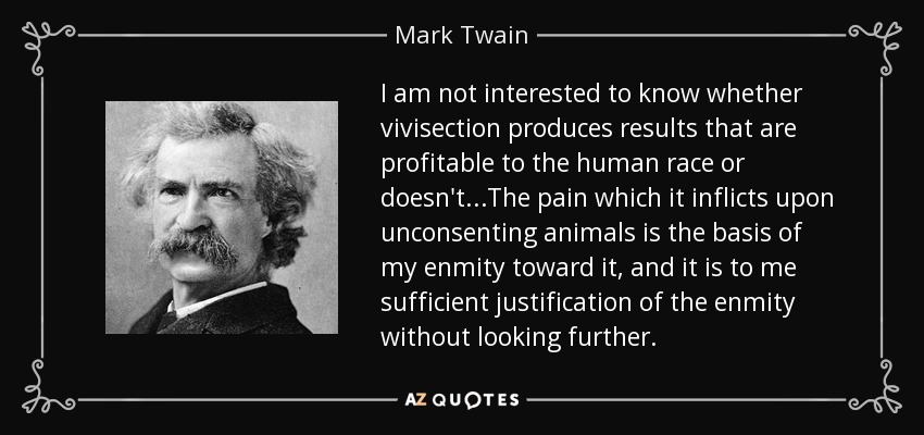 I am not interested to know whether vivisection produces results that are profitable to the human race or doesn't...The pain which it inflicts upon unconsenting animals is the basis of my enmity toward it, and it is to me sufficient justification of the enmity without looking further.