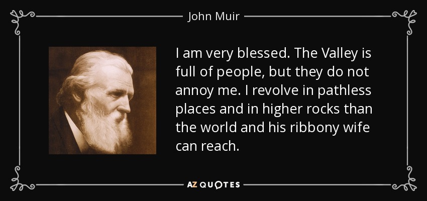 I am very blessed. The Valley is full of people, but they do not annoy me. I revolve in pathless places and in higher rocks than the world and his ribbony wife can reach.