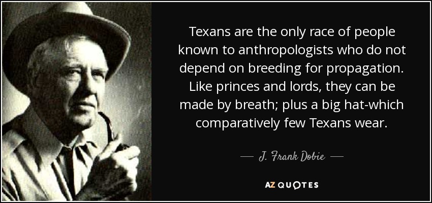 Texans are the only race of people known to anthropologists who do not depend on breeding for propagation. Like princes and lords, they can be made by breath; plus a big hat-which comparatively few Texans wear.