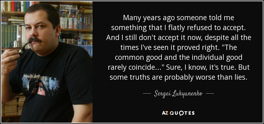 Many years ago someone told me something that I flatly refused to accept. And I still don't accept it now, despite all the times I've seen it proved right. "The common good and the individual good rarely coincide..." Sure, I know, it's true. But some truths are probably worse than lies.
