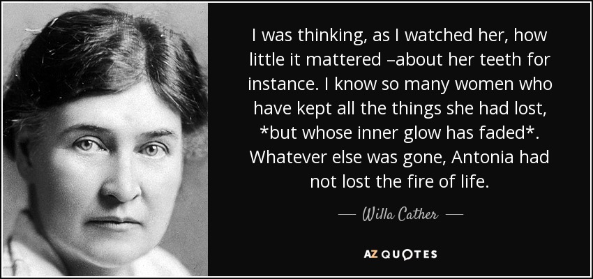 I was thinking, as I watched her, how little it mattered –about her teeth for instance. I know so many women who have kept all the things she had lost, *but whose inner glow has faded*. Whatever else was gone, Antonia had not lost the fire of life.