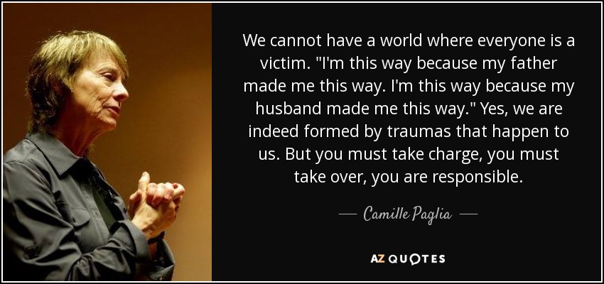 We cannot have a world where everyone is a victim. "I'm this way because my father made me this way. I'm this way because my husband made me this way." Yes, we are indeed formed by traumas that happen to us. But you must take charge, you must take over, you are responsible.