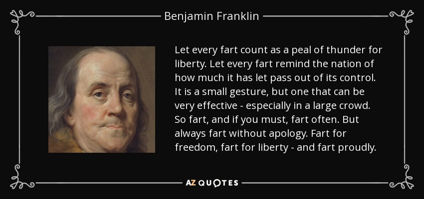 Let every fart count as a peal of thunder for liberty. Let every fart remind the nation of how much it has let pass out of its control. It is a small gesture, but one that can be very effective - especially in a large crowd. So fart, and if you must, fart often. But always fart without apology. Fart for freedom, fart for liberty - and fart proudly.