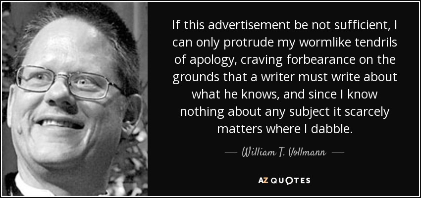 If this advertisement be not sufficient, I can only protrude my wormlike tendrils of apology, craving forbearance on the grounds that a writer must write about what he knows, and since I know nothing about any subject it scarcely matters where I dabble.