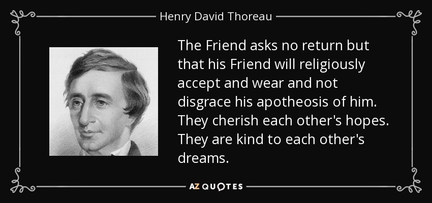 The Friend asks no return but that his Friend will religiously accept and wear and not disgrace his apotheosis of him. They cherish each other's hopes. They are kind to each other's dreams.