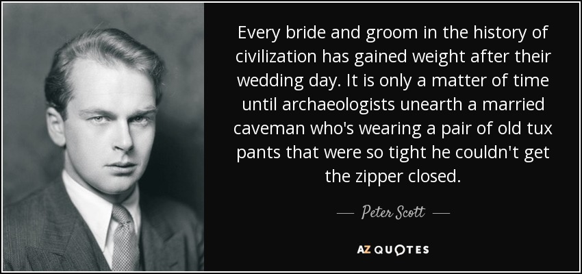 Every bride and groom in the history of civilization has gained weight after their wedding day. It is only a matter of time until archaeologists unearth a married caveman who's wearing a pair of old tux pants that were so tight he couldn't get the zipper closed.