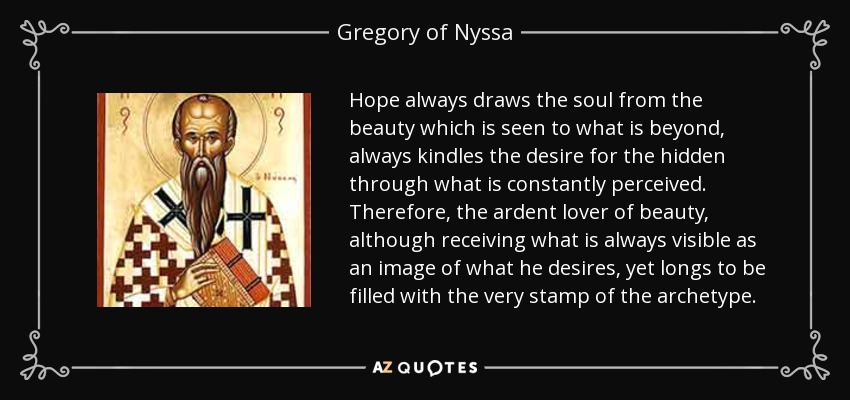 Hope always draws the soul from the beauty which is seen to what is beyond, always kindles the desire for the hidden through what is constantly perceived. Therefore, the ardent lover of beauty, although receiving what is always visible as an image of what he desires, yet longs to be filled with the very stamp of the archetype.