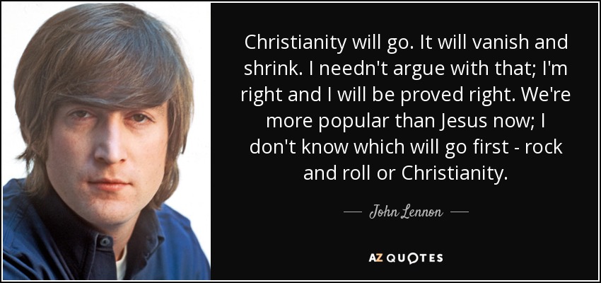 Christianity will go. It will vanish and shrink. I needn't argue with that; I'm right and I will be proved right. We're more popular than Jesus now; I don't know which will go first - rock and roll or Christianity.