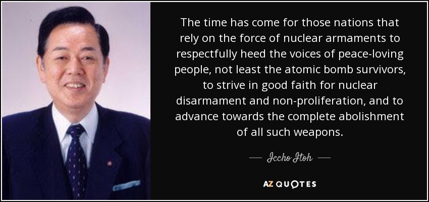 The time has come for those nations that rely on the force of nuclear armaments to respectfully heed the voices of peace-loving people, not least the atomic bomb survivors, to strive in good faith for nuclear disarmament and non-proliferation, and to advance towards the complete abolishment of all such weapons.