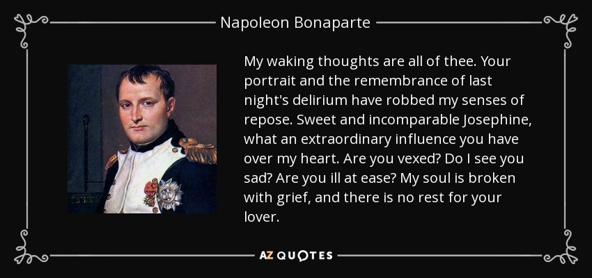 My waking thoughts are all of thee. Your portrait and the remembrance of last night's delirium have robbed my senses of repose. Sweet and incomparable Josephine, what an extraordinary influence you have over my heart. Are you vexed? Do I see you sad? Are you ill at ease? My soul is broken with grief, and there is no rest for your lover.