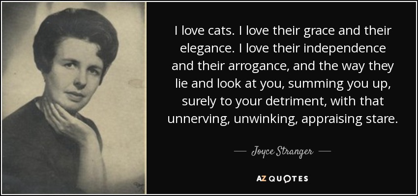 I love cats. I love their grace and their elegance. I love their independence and their arrogance, and the way they lie and look at you, summing you up, surely to your detriment, with that unnerving, unwinking, appraising stare.