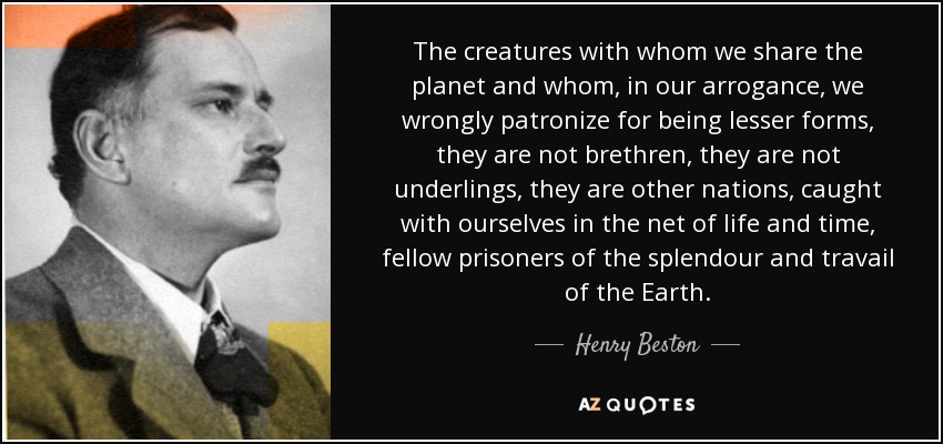 The creatures with whom we share the planet and whom, in our arrogance, we wrongly patronize for being lesser forms, they are not brethren, they are not underlings, they are other nations, caught with ourselves in the net of life and time, fellow prisoners of the splendour and travail of the Earth.