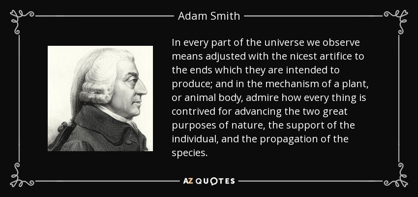 In every part of the universe we observe means adjusted with the nicest artifice to the ends which they are intended to produce; and in the mechanism of a plant, or animal body, admire how every thing is contrived for advancing the two great purposes of nature, the support of the individual, and the propagation of the species.