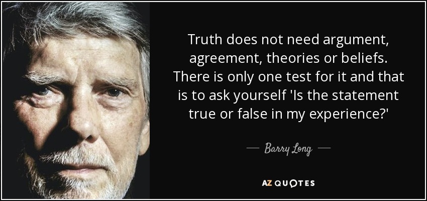 Truth does not need argument, agreement, theories or beliefs. There is only one test for it and that is to ask yourself 'Is the statement true or false in my experience?'